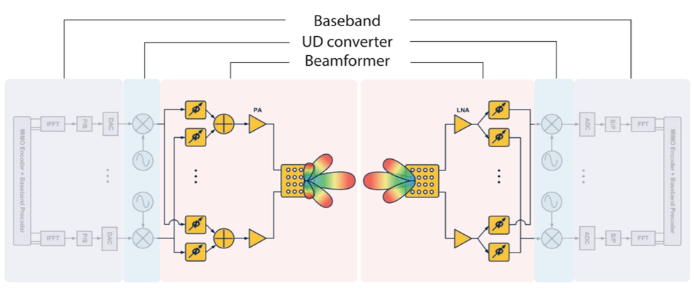 A complete mmWave system is divided into three parts: the baseband, up-down converter and beamformer.